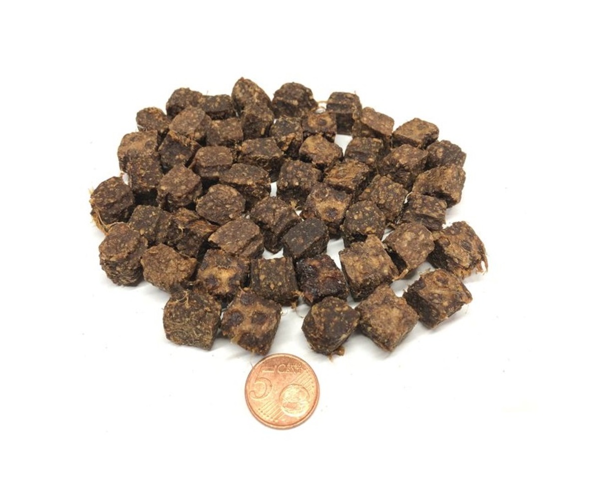 Deze blokjes zijn van 100% gedroogd vlees ( organen, spiervlees en bot ) van Eend. Afmeting is ongeveer 1,5×1 cm. Vleesblokje zit tussen hard en zacht in. Goed te gebruiken voor training, beloning of als tussendoortje. Geschikt voor alle honden jong tot oud. Eend is Hypoallergeen en zeker erg goed voor honden met een eliminatiedieet of allergieën. Herkomst 100% Eend / EU. Uiteraard zonder enige toevoegingen!
