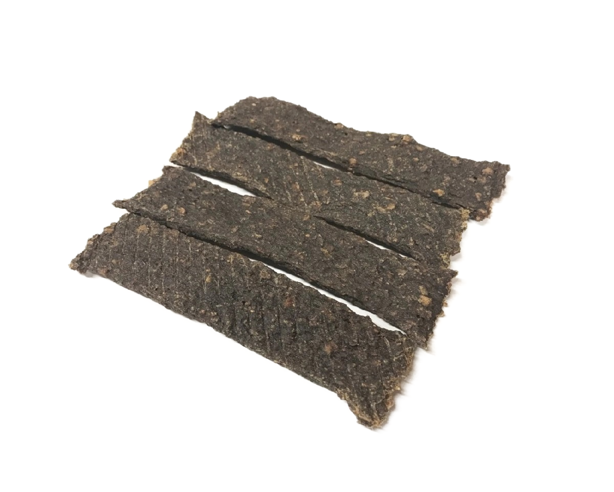 De vleesstrips zitten in een handig hersluitbaar zakje.