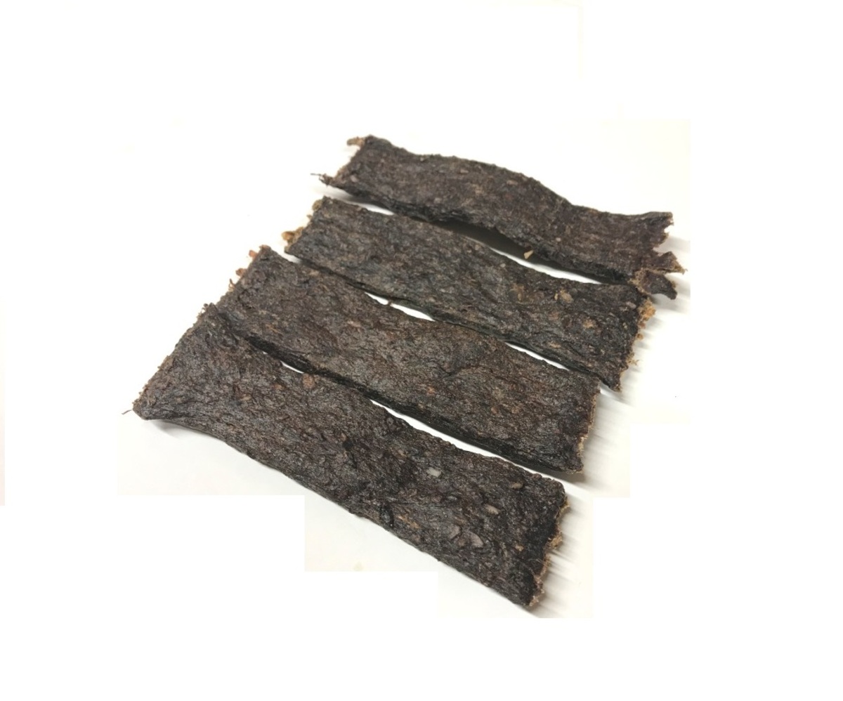 De vleesstrips zitten in een handig hersluitbaar zakje.
