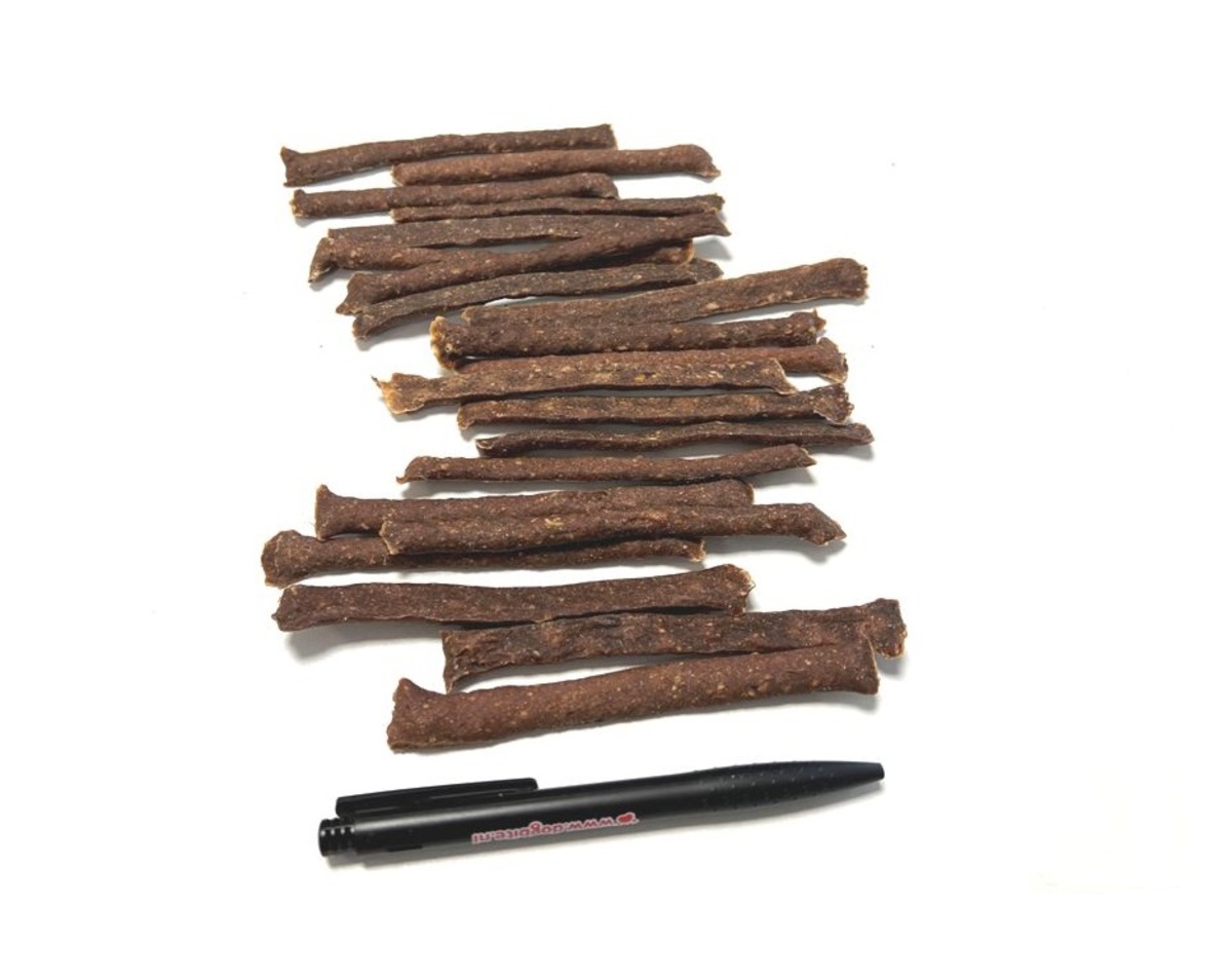De vleesstick is 100% natuurlijk! De stick is hard, maar ook erg gemakkelijk om te breken en als kleine stukjes te geven. Acceptatie is heel erg goed.