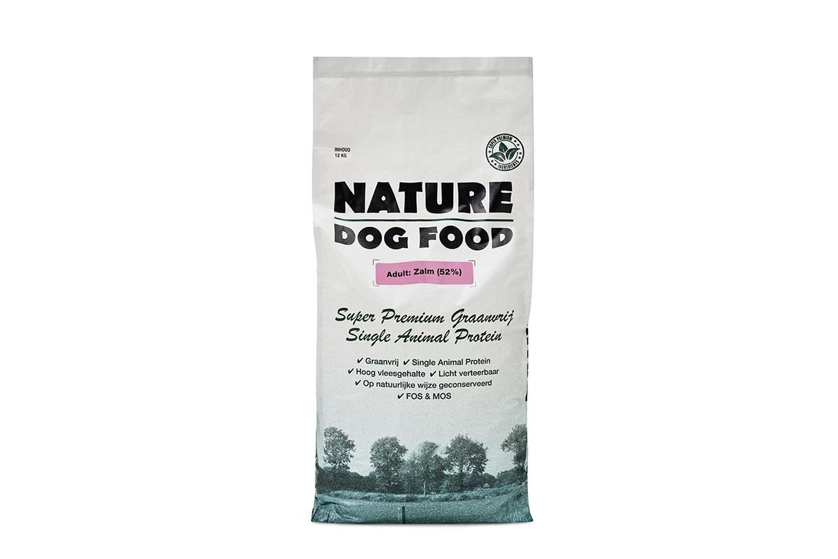 Nature Dog Food hypoallergeen hondenvoer is gemaakt met 52% zalm en bevat geen granen, mais of gluten in de receptuur.