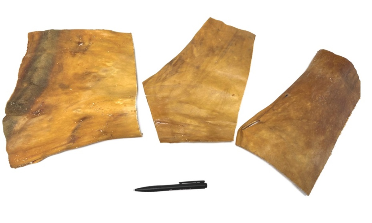 Op natuurlijke wijze gedroogde Paarden Kophuidplaten van circa 30×30 cm. Er kunnen soms ook iets kleinere stukken tussen zitten.